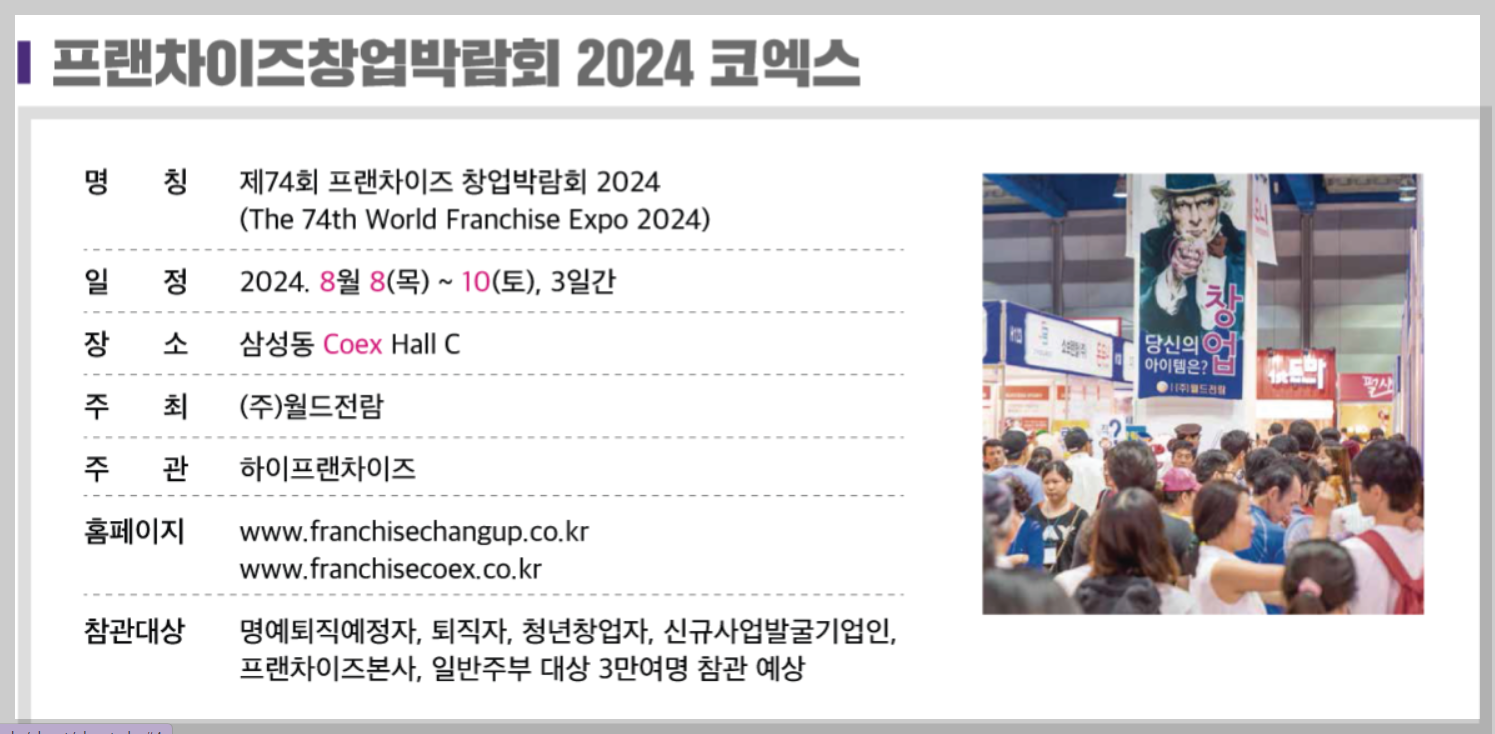 이번 제74회 프랜차이즈 창업박람회 2024는 8월 8일(목)~10일(토) 3일간 코엑스몰에서 열렸다. 무더위가 한창인 폭염 속에서 명예퇴직예정자, 청년창업자등 3만여 명이 방문하였다. 이번포스팅은 참관업체와 현재 외식의 흐름에 대해서 포스팅해 보겠다.