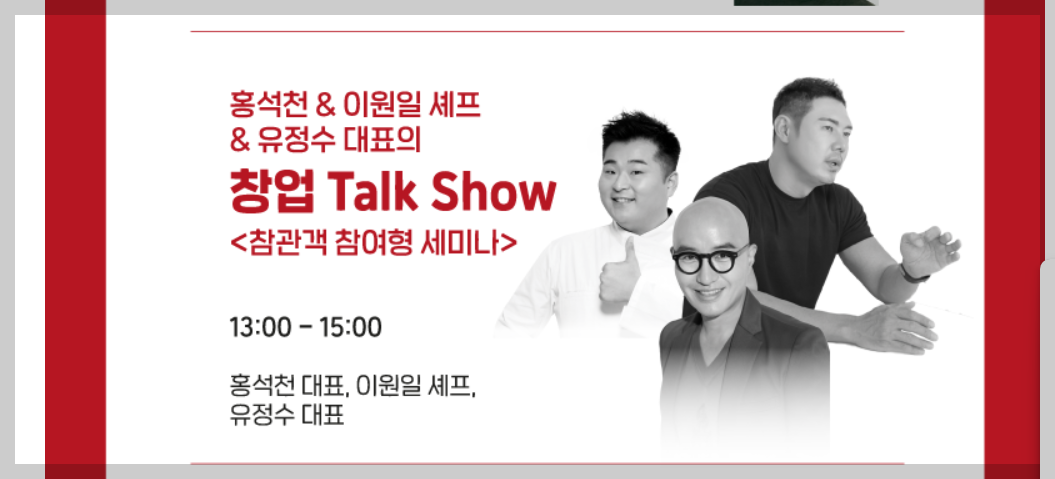 창업박람회 부스위치와 참석 외식업체는 사진으로 올려놓았는데 잘 보이지 않으니 아래에서 차츰 얘기해 보기로 하고 이번 전람에서는 창업세미나도 진행을 했다. 8일(목)에는 나무야컴퍼니 대표라는 사람의 '사랑받는 브랜드운영포인트 ', TTT문화기획사대표라는 사람의 '지속가능한 브랜드란 무엇일까?' 홍석천/이원일세프/유정수의 '창업 Talk Show' , 9일(금)에는 인사이드 플랫폼대표의 [2024 F&B소비트렌드, 변화의 시대 외식소비자는 무엇을 원하는가?], 포레테바리스타 대표의 [소자본 개인카페창업과 소자본 브랜차이즈 카페창업의 진짜차이], 스토리소사이어티대표의 [시작하는 브랜드를 위한 스토리텔링], 10일(토)에는 00 소장의 [판이 바뀌는 하반기 창업트렌드와 프랜차이즈성공방적식], 예진컴퍼니대표의 [소상공인 정부지원사업 활용과 사업계획서 작성노하우] 이런 강의가 진행이 되었다
